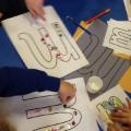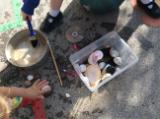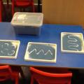 Because many of the children are really enjoying the train set, we took that outside into the environment, so that they could create a whole world for the train to ride through. They used their imaginations to incorporate 2D shapes to make tracks and pathways through sand hills too.